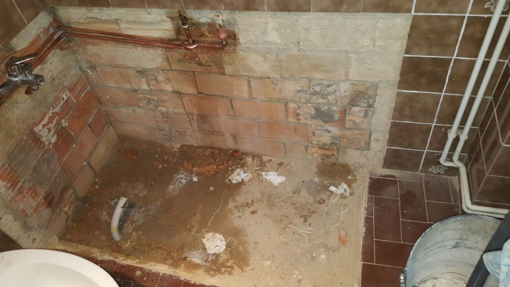 Cuando tenemos solo una pared donde ubicar el grifo, y además las pendientes de desagüe no son buenas, nos vemos obligados a cambiar el desagüe de ubicación para permitir una rápida evacuación del agua del plato de ducha. En esta ocasión, y debido a los motivos indicados con anterioridad, tuvimos que elevar el plato de ducha.