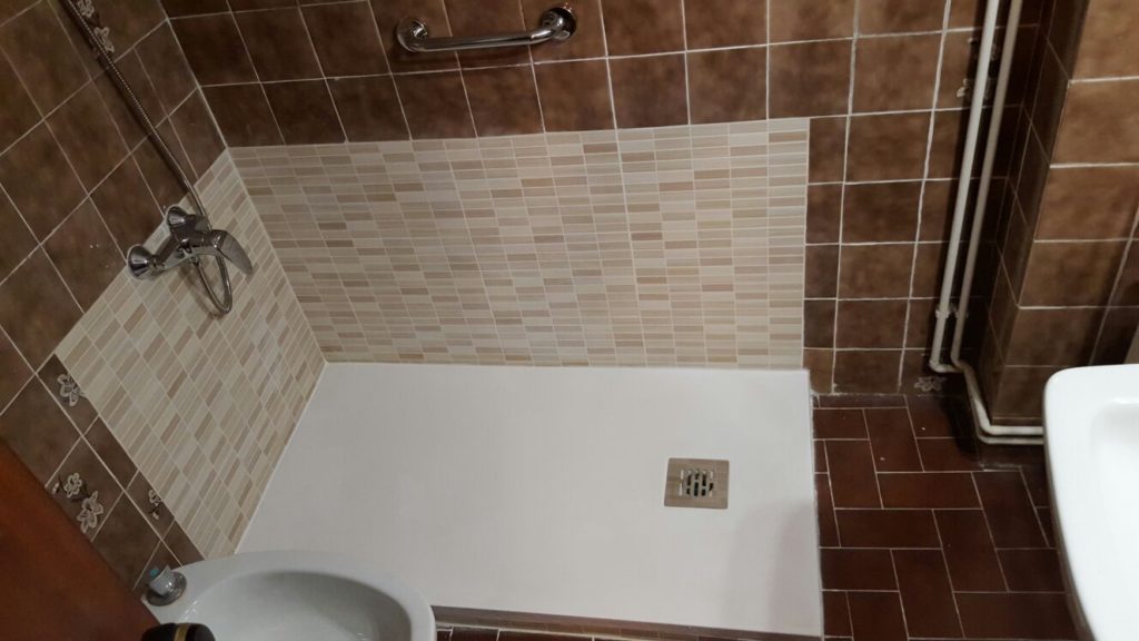 En este baño de reducidas dimensiones la bañera no era muy grande, pero nuestro cliente no quería un plato de mayor tamaño. Así que respetamos su decisión y colocamos un plato igual que la bañera.